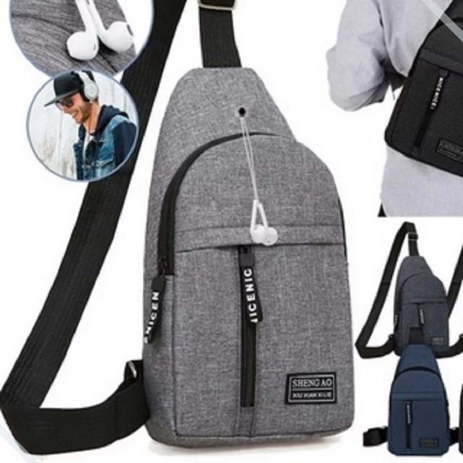 Bolsa pochete transversal em lona com 2 compartimentos com zíper e saída para fone com alça ajustável e impermeável.