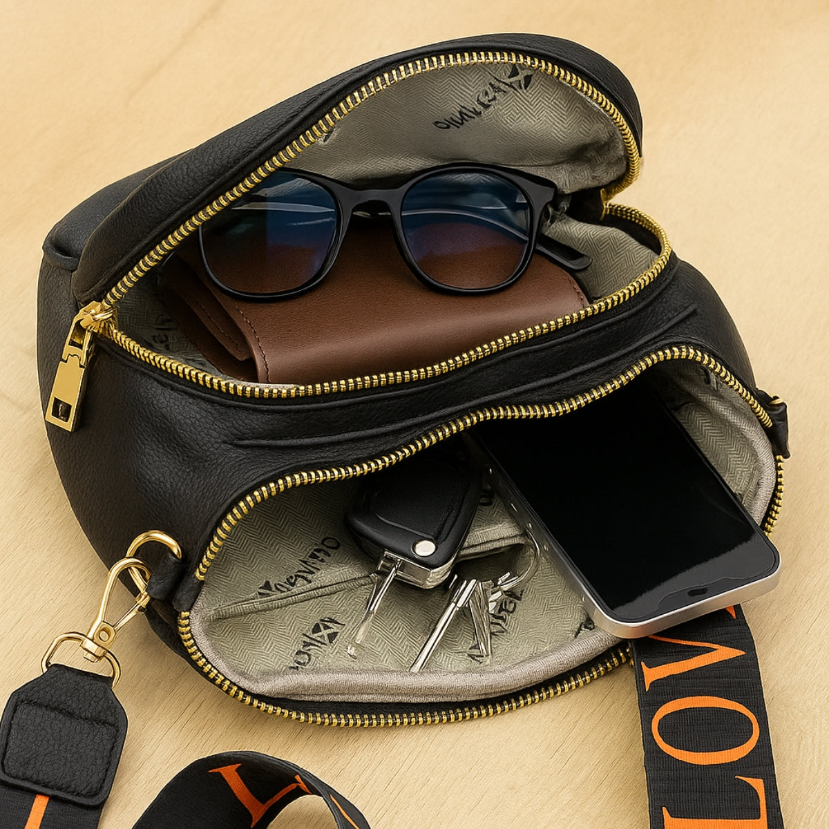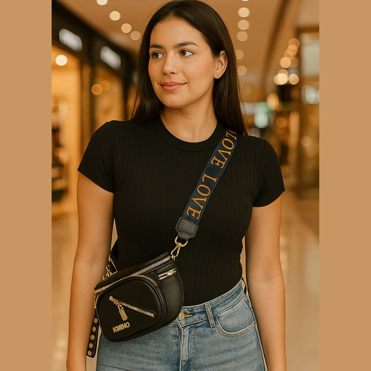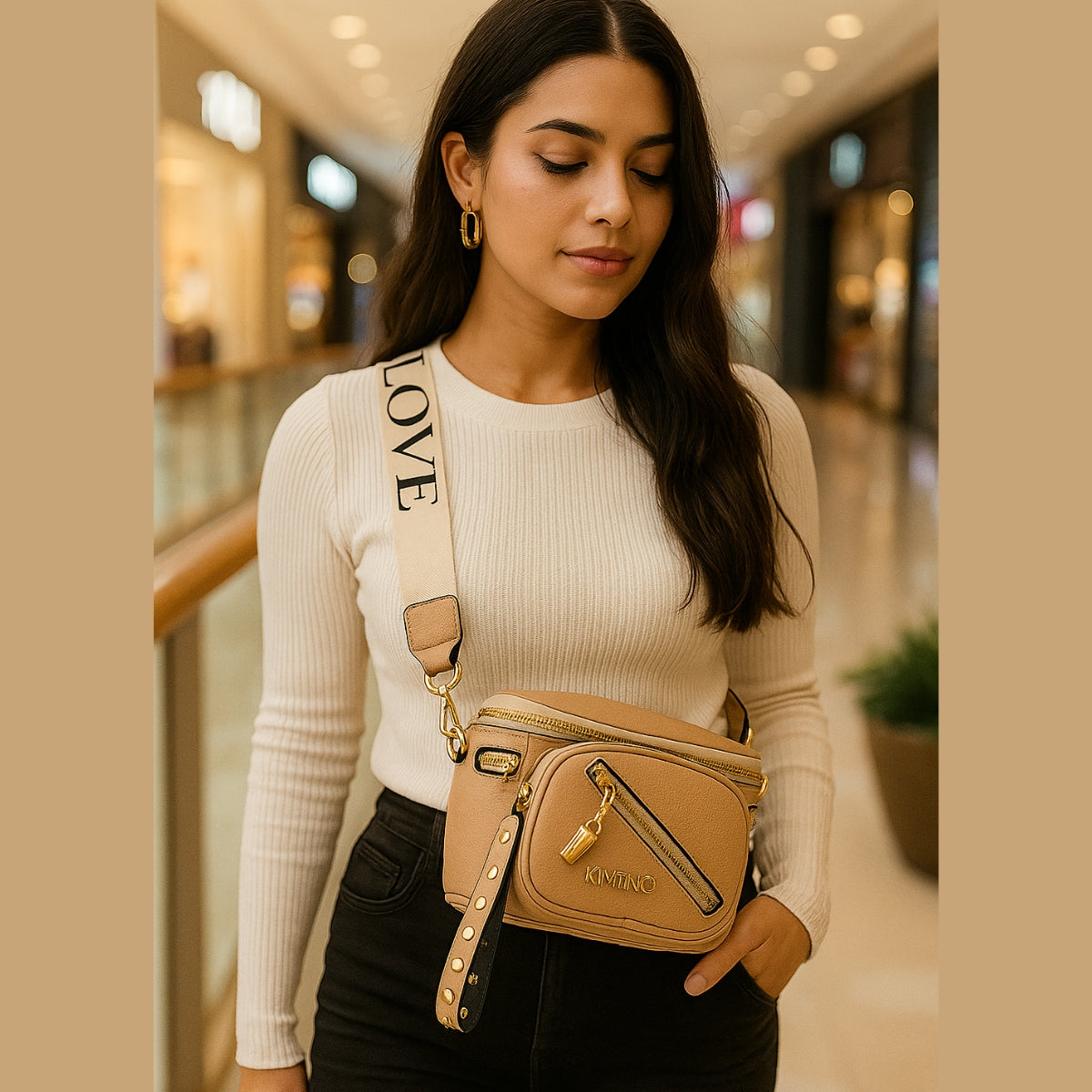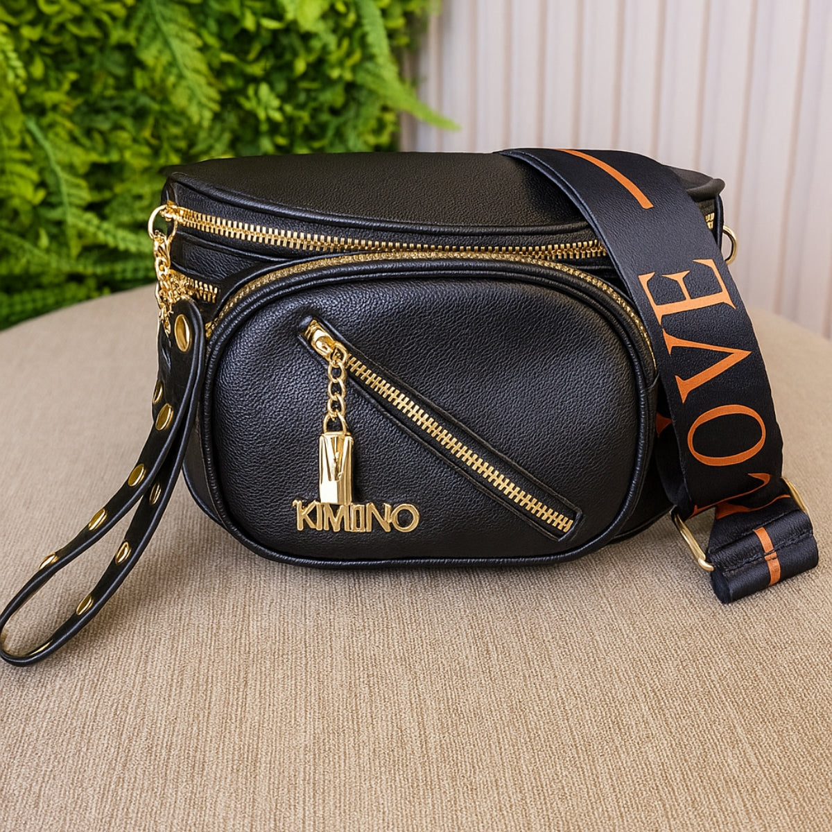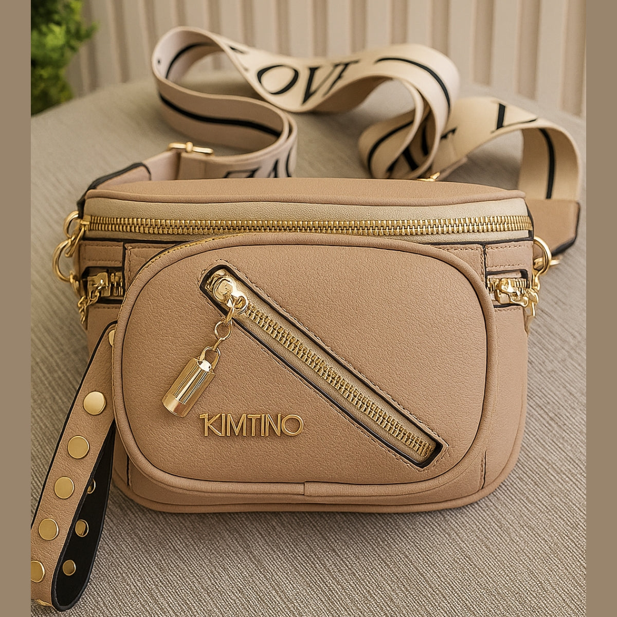 Possui 3 bolsos com zíper, ideais para manter seus itens organizados e seguros, e detalhes em metais dourados, que dão um acabamento sofisticado ao visual.